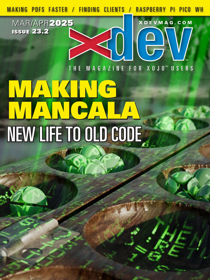 Plus: An interview with Geoff Perlman, using GameInput classes, custom sorting routines, building Xojo Tennis game, and more!